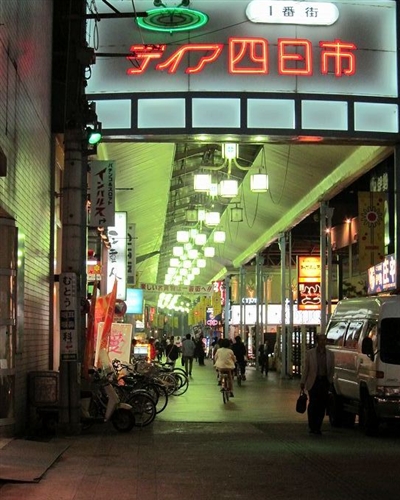 近鉄四日市駅からパチ屋のナショナル会館を入っていくと、所狭しと商店が、シャッターも目立ちますが。