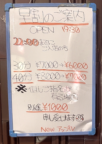 22時までに入店すると30分7000円がなんと6000円で利用できるのです。